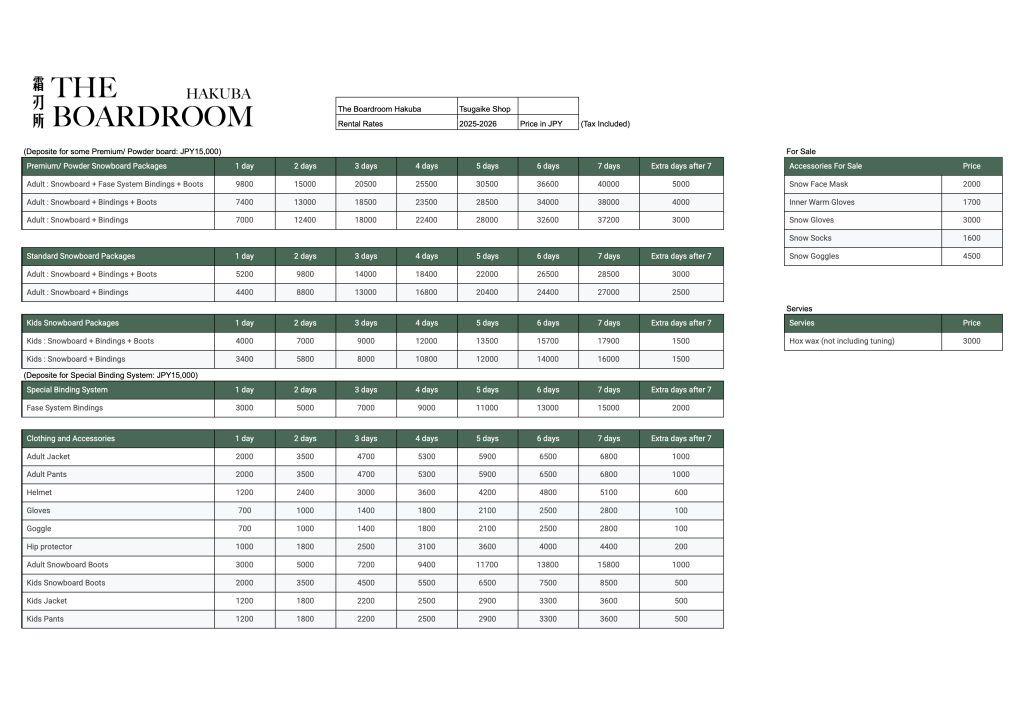The Boardroom JP offers snowboard rentals in Japan. The first shop is located near Tsugaike Mountain Resorts in Hakuba.